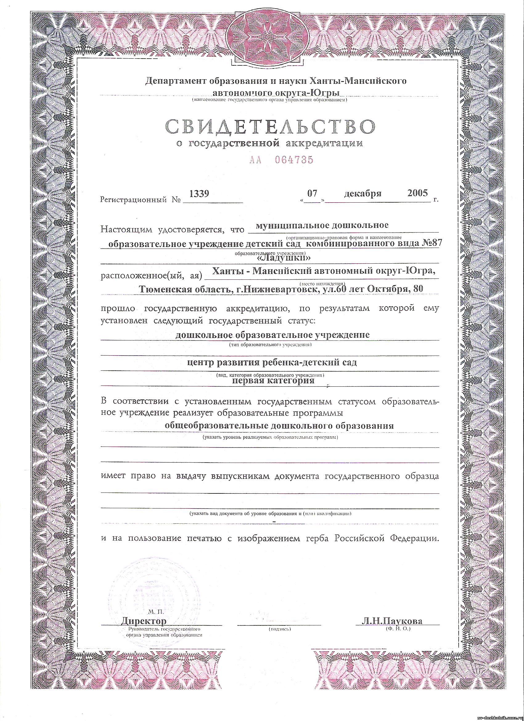 Свидетельство о государственной аккредитации рег.№ 1339 от 07 декабря 2005г.